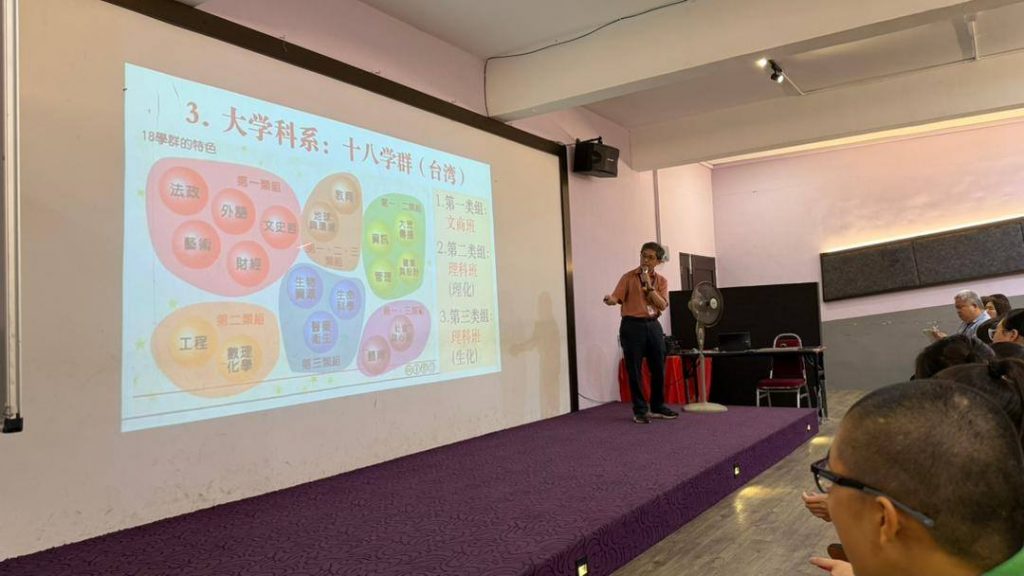 📊 接着,文商科主任詹敬仁主任则以实际数据,引导同学们思考升上高中的另一种选择方式,以及往后升大学相关学系的关联性,提早给同学们选科系的一些概念。