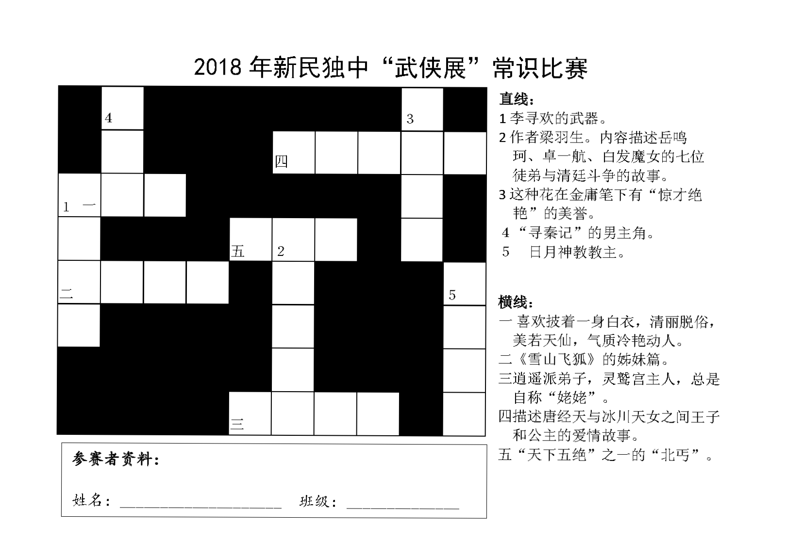 为了配合活动,图书馆同时举办武侠小说填字游戏,并准备了50份武林秘笈笔记本及50套武侠小说书签,作为参加活动的礼物。师生可向图书馆索取填字游戏表格,并在展览资料中搜寻答案,以获取以上礼物,此项活动获得了师生的积极响应,也促进了大家对武侠小说的认识及讨论。