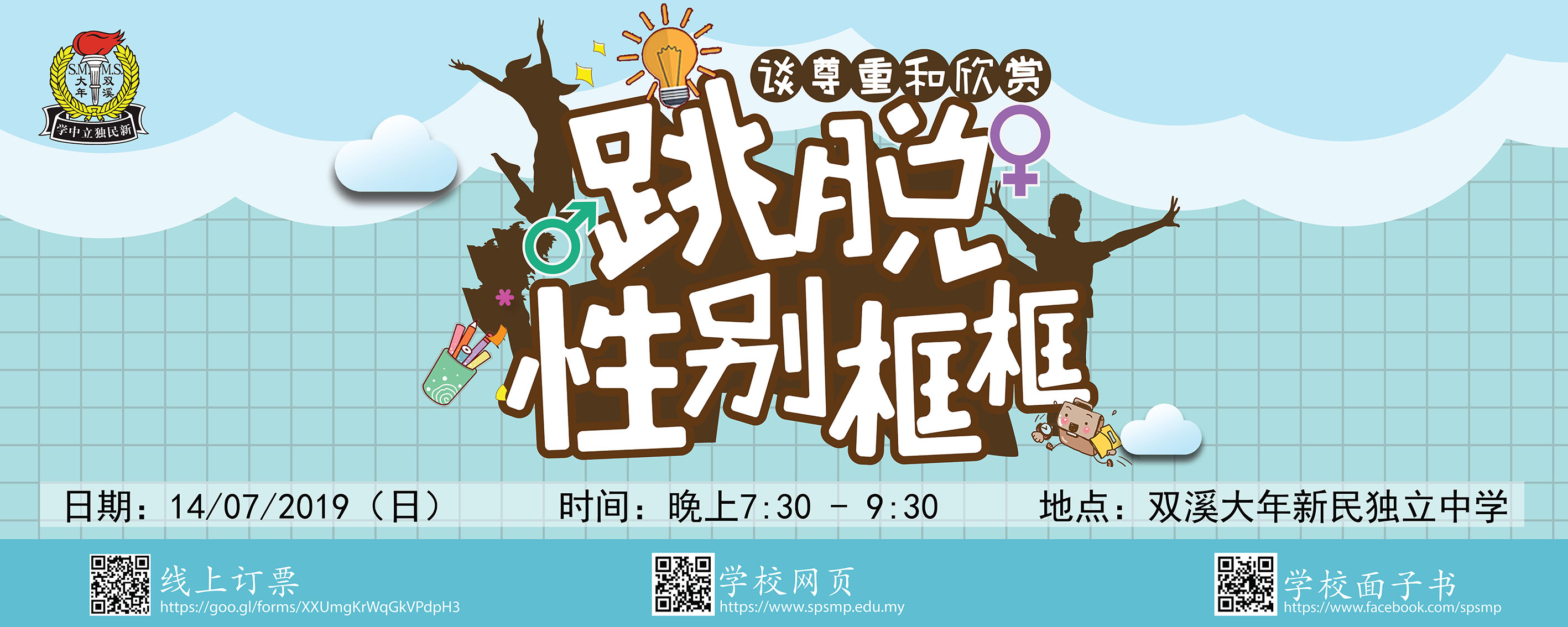欢迎于7月14日,晚上7时30分到双溪大年新民独立中学礼堂,聆听由台湾性学会认证合格的性教育讲师蔡福花老师主讲的《跳脱性别框框-谈尊重和欣赏》。