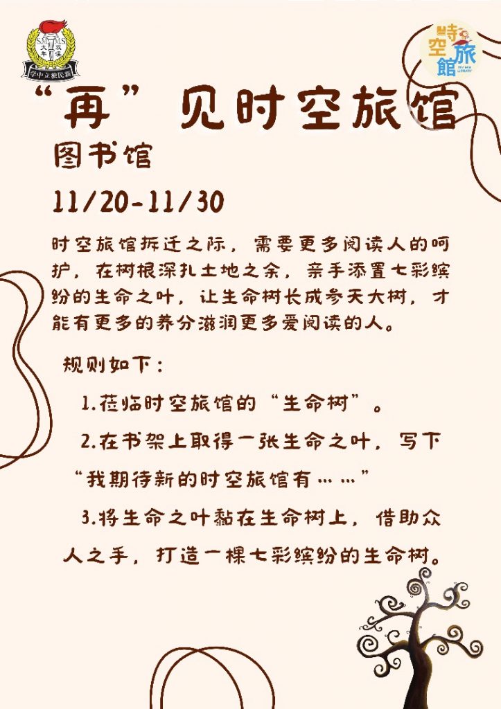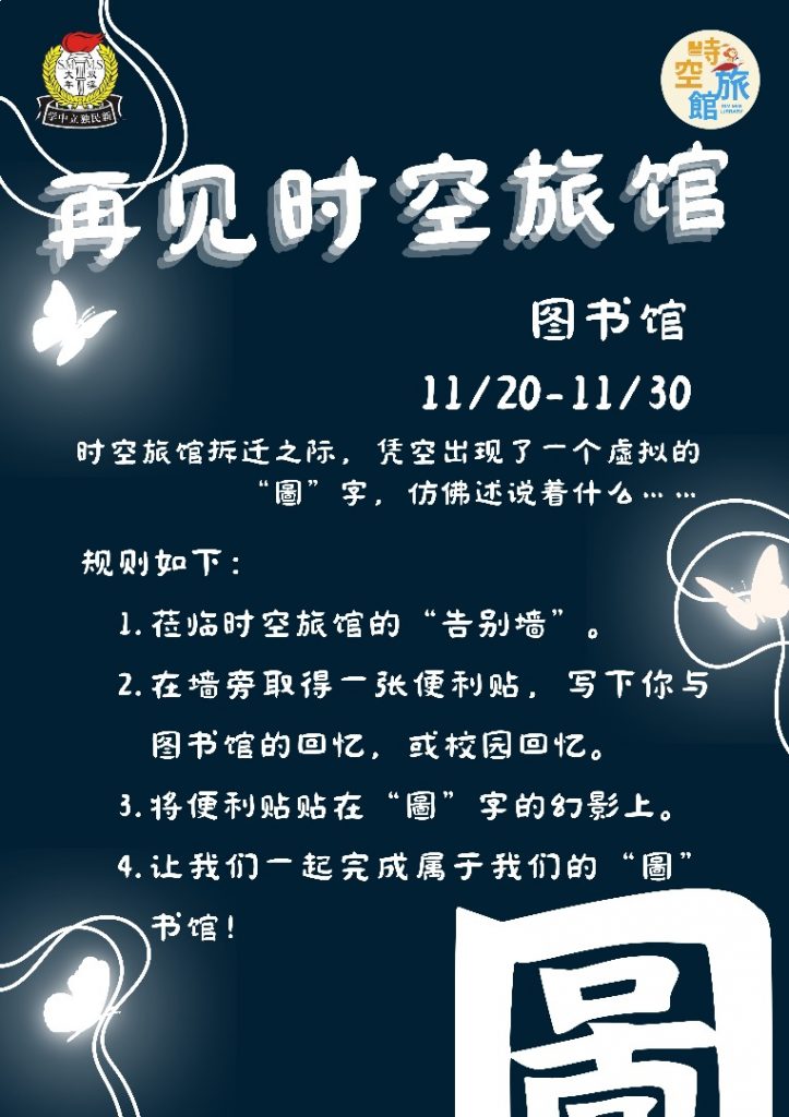 为配合宿舍工程,时空旅馆现址将走入历史。本馆期盼全体师生的莅临,共同参与本周推出的两项告别活动:《再见时空旅馆》及《“再”见时空旅馆》