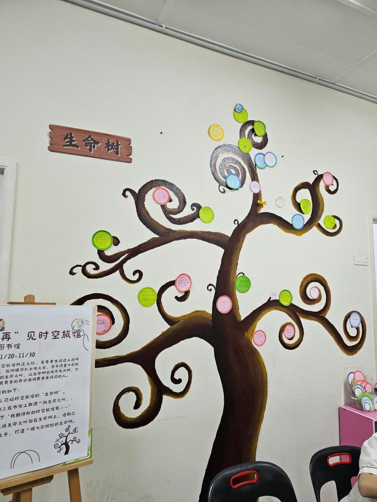 时空旅馆的另一面墙上 出现了一棵生命树,在此广邀全体师生到时空旅馆的生命树上,为生命树增添生命之叶,留下你对新时空旅馆的愿景……