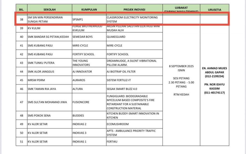 届时, 同学们将于2025年9月8日()到RTM Kedah决赛现场去呈现他们所发明的创作理念,祝福同学们可以在这次的发表中争取荣誉。同学们加油。 💪👍