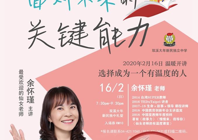 担心大家白跑一趟,在活动开始前,再次叮咛大家讲座已经展期了。 😭 【活动展期通知】 感谢大家对本场讲座的热烈响应,唯因新冠肺炎全球疫情局势,以及我国已出现本土感染的确诊病例,经慎重考虑后,本校决定展延此讲座至另行通知为止,届时希望大家能热情出席。 主题:培养孩子面对未来的关键能力主讲:仙女老师 余怀瑾主办:双溪大年新民独中日期/时间/地点:活动展期至另行通知为止。 如有退票或任何问题,请…